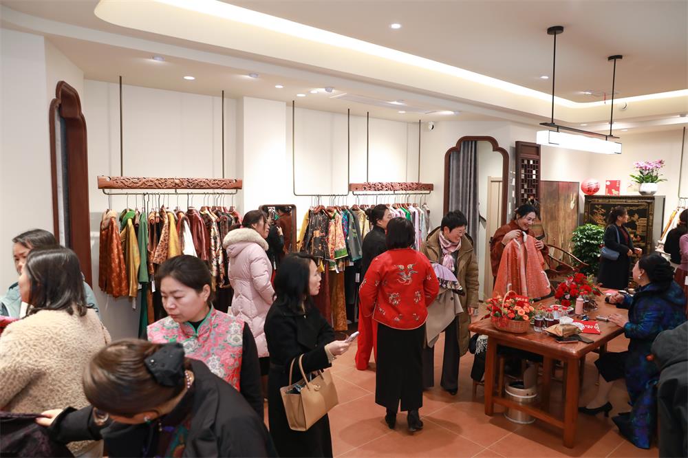 设计师徐华荣与客户代表缪文玲分别发言,介绍了产品设计理念和讲述了与华慧品牌相伴走过的历程,并对华慧匠衣的新装开业表达祝福。随后,到场领导与嘉宾共同上台,为华慧匠衣高定美学馆开业揭牌与剪彩。